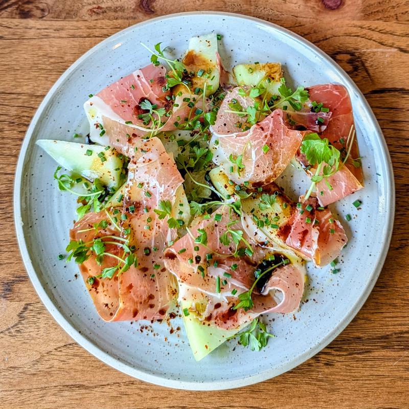 Sliced melon, prosciutto, saba, basil oil, harissa & Aleppo pepper.