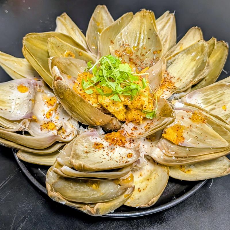 Deconstructed artichoke with paprika, garlic, garlic and vinegar marinated hearts