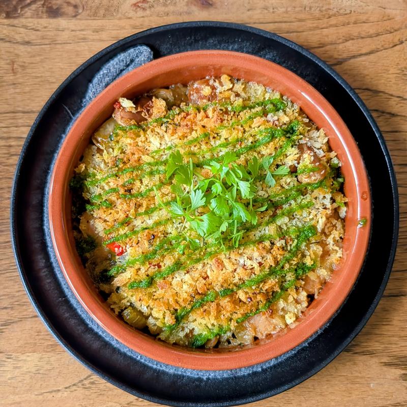 Beans with sun-dried tomato red bell pepper sauce, thyme breadcrumbs and herb oil.